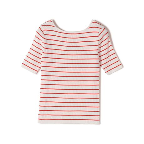 コンパクトなシルエットとスクエアネックが、すっきりと女性らしい印象のリブニット。