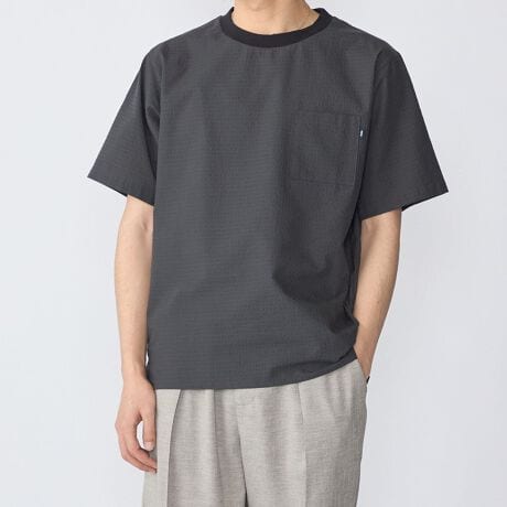 シンプルながらもシアサッカーの上品な生地感が、普段のTシャツとはまた違った雰囲気を出してくれる1枚です。