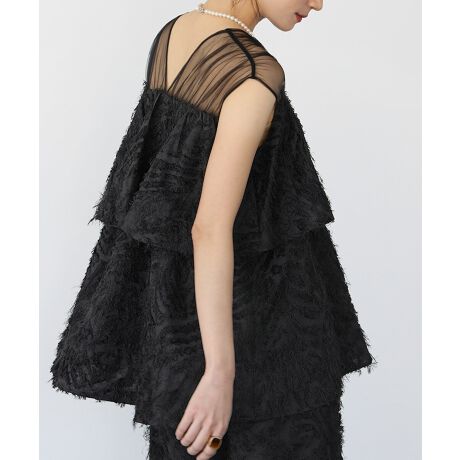 シアーショルダーがラグジュアリーな二段フレアチュニック。