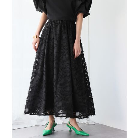 目を惹くジャガード素材を使用した、ギャザーフレアスカート。