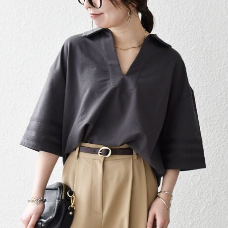 抜け感のあるスキッパー襟が顔まわりを軽やかに見せる、Vネックカットソー。