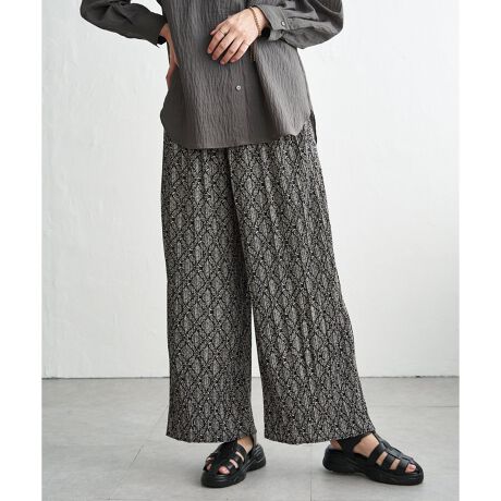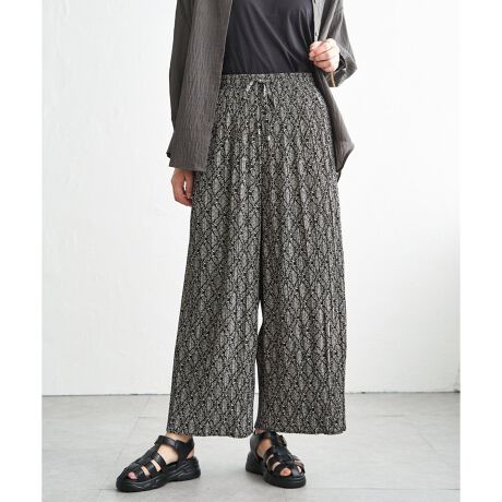 広がりすぎないワイドシルエットと細かなプリーツが縦ラインを強調し、すっきりとした印象に仕上げてくれる一着。