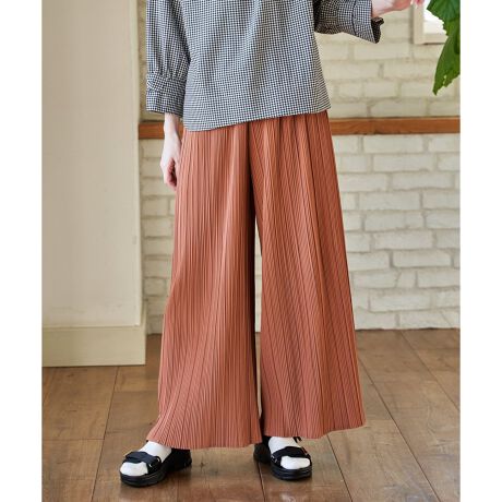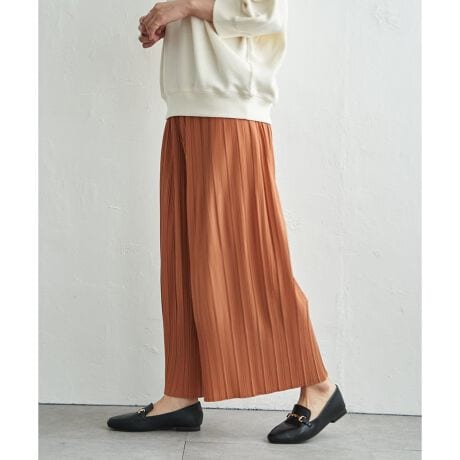 広がりすぎないワイドシルエットと細かなプリーツが縦ラインを強調し、すっきりとした印象に仕上げてくれる一着。
