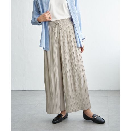 広がりすぎないワイドシルエットと細かなプリーツが縦ラインを強調し、すっきりとした印象に仕上げてくれる一着。