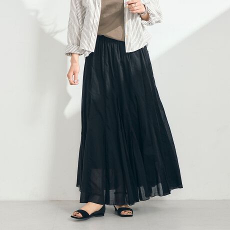 ウエストはオールゴムでストレスフリーな履き心地です。シルエットが可愛く、動くたびにふわっと揺れるのが印象的です。足首にかかるやや長めの丈感ですが、ボリュームがありながらも軽やかな素材感で重たく見えず、バランスよく着られました。ナチュラルな風合いで、デイリーに取り入れやすい一枚です。