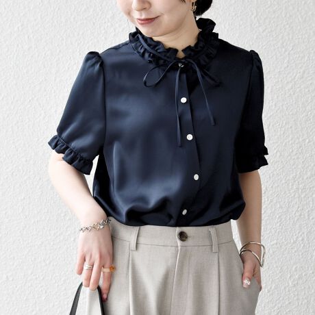 フリルとリボンが大人可愛いサテンブラウス。