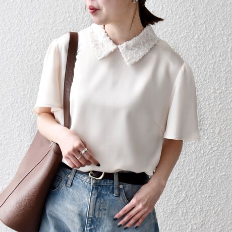 繊細なレース襟が目を引くサテンブラウス。