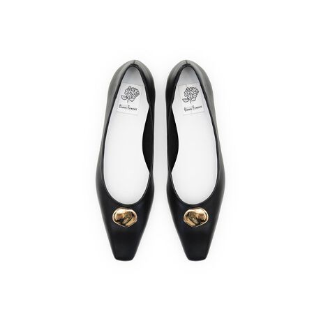 フレンチスクエアトゥに、ニュアンスのある丸形モチーフをあしらったデザインパンプス。