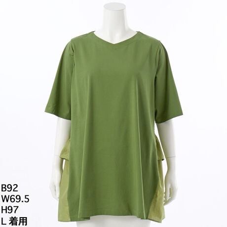 [型番:6702108]接触冷感+抗菌機能付きの天竺を使用。抗菌機能は、清潔感の維持や汗のにおいを抑えてくれる効果があります。後ろ身には同色系のローン生地を使用してポイントにしています。一枚でかっこよくきまるチュニックです。グリーンノート 大きいサイズ レディース ゆったり 接触冷感 半袖 抗菌 チュニック