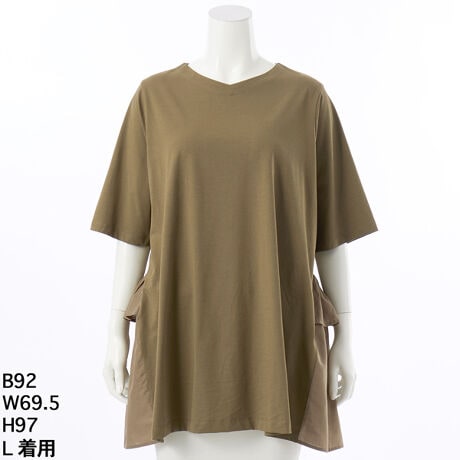 [型番:6702108]接触冷感+抗菌機能付きの天竺を使用。抗菌機能は、清潔感の維持や汗のにおいを抑えてくれる効果があります。後ろ身には同色系のローン生地を使用してポイントにしています。一枚でかっこよくきまるチュニックです。グリーンノート 大きいサイズ レディース ゆったり 接触冷感 半袖 抗菌 チュニック