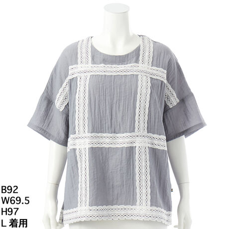 [型番:6705104]レーヨンナイロンのサラサラとした生地を使用。ナチュラルなシボ感があるのでシワが気になりにくいです。繊細なレースがアクセントのシリーズです。前身に格子状にレースをたたき付けています。無地のプレーンなブラウスが華やかに変身しました。ゆったりとしたサイズ感なので通気性も良く快適な着心地です。一枚で主役になれるブラウスです。グリーンノート 大きいサイズ レディース ゆったり レース 半袖 涼しい シボ感