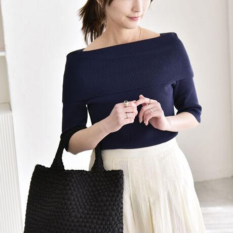 ワイドに折り返したオフショルダーデザインが印象的なリブニットトップス。