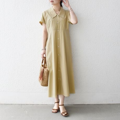 やや深めに開いたフラットカラーがクラシックな印象のAラインフレアワンピース。
