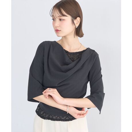 レースが映える大人可愛いドレープトップス繊細なレースを重ねたレイヤードデザインが魅力のプルオーバーです。胸元にやわらかく流れるドレープが女性らしい立体感を生み、顔まわりを優しく華やかに見せてくれます。裾からのぞくレースがコーディネートに奥行きをプラスし、シンプルなボトムと合わせるだけで上品な印象に仕上がります。程よくゆとりのあるシルエットで体のラインを拾いにくく、リラックスした着心地です。きれいめパンツやスカートと合わせれば通勤スタイルに、デニムと合わせれば大人カジュアルにも活躍します。オンオフ使えるトップスとして、着回し力の高い一枚です。透け感[なし]