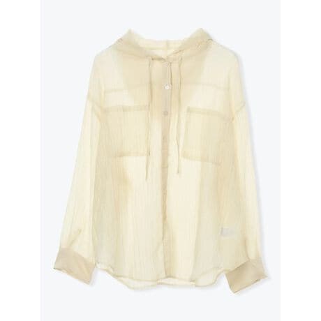 [型番:26550735368]軽やかなシアー素材が涼しげな印象を与えるフード付きシャツ。ゆったりとしたビッグシルエットと大きめのポケットが、抜け感のあるカジュアルな雰囲気を演出します。タンクトップやキャミソールにさらりと羽織るだけで、季節感のあるレイヤードスタイルが楽しめる一枚です。モデル(青/白着用)身長:165cmMサイズ着用