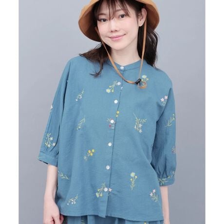 カラフルな草花の刺繍を麻混の生地にのせて、爽やかに仕上げました。