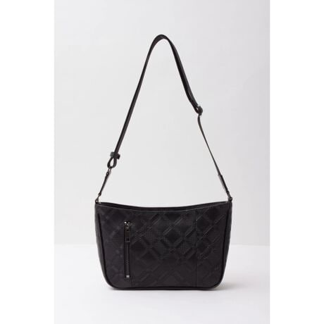 格子状に走る型押しがつくる陰影と立体感が最大の魅力。フラットになりがちなブラックでも表情が出るので、シンプルなスタイリングに合わせるだけで全体が引き締まります。