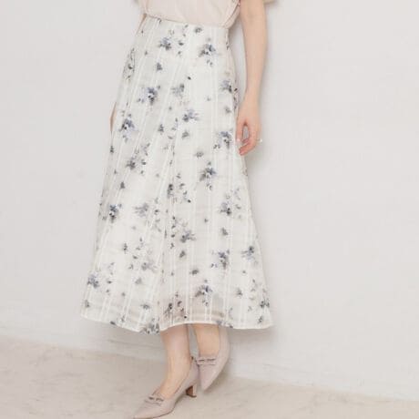 チェック生地にオリジナルの花柄のプリントを施した1枚で着映えるフレアスカートです。