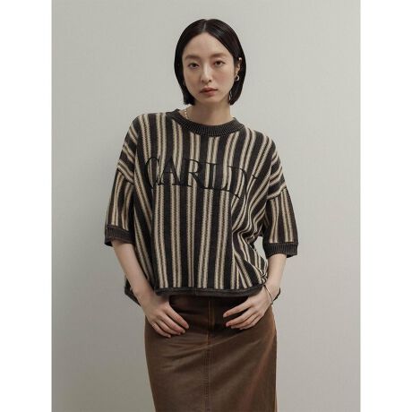 ロゴ×ストライプが大人カジュアルな雰囲気を漂わせるドルマンスリーブトップス。