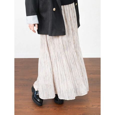 細めの繊細なプリーツが歩くたびにふわりと揺れ、女性らしいシルエットを描きます。