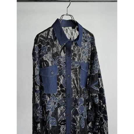 衿やカフス、ポケットをデニム地に切り替え、さらに袖にラインデザインを施すことで、甘くなりがちなレースにシャープなアクセントをプラスしました。