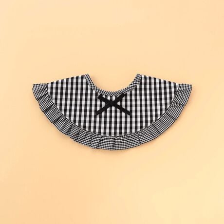 大小の柄サイズ違いのギンガムチェックにブラックの小さなリボンを添えたモードな面と、