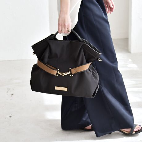 合成皮革のハンドル部分は、持ち上げると自然とくったりとした台形フォルムになり、こなれ感のあるシルエットに。