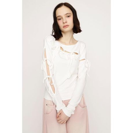 【CUT OUT RIBBON TOPS】■POINTアシンメトリーなスリットデザインにリボンをあしらったデザインカットソートップス。程よい肌見せが抜け感のある女性らしい印象のアイテムです。遊び心のあるデザインで1枚で着映えします。■DETAILフロントと袖部分に施したスリットデザインに、共地リボンをあしらったデザインがポイント。デコルテを美しく見せるネックラインと、程よくフィットするボディラインが上半身の華奢見えを叶えます。柔らかく伸縮性の良いベアフライス素材がストレスフリーな着心地です。オフホワイトとブラックに加えて、春のシーズンムードを感じさせるライトパープルの3色展開です。■STYLING王道のデニム合わせはもちろん、ミニスカートと合わせたガーリーなスタイリングもおすすめです。ジャケットなどのインナーとしても使用しやすく、アウターを開けて着用した時にフロントのデザインがポイントになります。■FABRIC/MATERIAL柔らかく伸縮性の良いベアフライス素材を使用。■透け感:なし■光沢感:ややあり■伸縮性:あり■裏 地:なし※お取り扱い上のご注意・本品は素材の特性上色落ちします。・洗濯、クリーニング、着用(使用)時に他の衣類や雑貨、家具類に色移りする事があります。・特に汗や雨等で湿った状態では、色落ちが顕著になります。・白、淡色との組み合わせは避け、お取り扱いには十分ご注意下さい。[注意事項]※画像の商品はサンプルです。実際の商品と仕様、加工が若干異なる場合があります。※画像の商品は光の照射や角度、お使いのモニター環境により、実物と色味が異なる場合がございます。※着用、お取り扱いの際は、アテンションタグをご確認ください。※一部予約商品につきましては生産上の都合によりお届け予定日や店頭発売と前後する場合もございます。※追加生産商品は、一部の店舗、通販で販売中の場合がございます。予めご了承下さい。