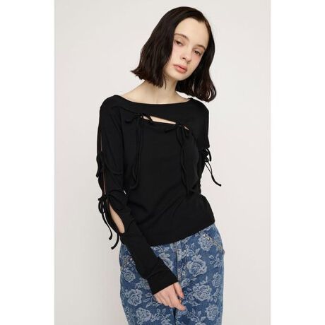 【CUT OUT RIBBON TOPS】■POINTアシンメトリーなスリットデザインにリボンをあしらったデザインカットソートップス。程よい肌見せが抜け感のある女性らしい印象のアイテムです。遊び心のあるデザインで1枚で着映えします。■DETAILフロントと袖部分に施したスリットデザインに、共地リボンをあしらったデザインがポイント。デコルテを美しく見せるネックラインと、程よくフィットするボディラインが上半身の華奢見えを叶えます。柔らかく伸縮性の良いベアフライス素材がストレスフリーな着心地です。オフホワイトとブラックに加えて、春のシーズンムードを感じさせるライトパープルの3色展開です。■STYLING王道のデニム合わせはもちろん、ミニスカートと合わせたガーリーなスタイリングもおすすめです。ジャケットなどのインナーとしても使用しやすく、アウターを開けて着用した時にフロントのデザインがポイントになります。■FABRIC/MATERIAL柔らかく伸縮性の良いベアフライス素材を使用。■透け感:なし■光沢感:ややあり■伸縮性:あり■裏 地:なし※お取り扱い上のご注意・本品は素材の特性上色落ちします。・洗濯、クリーニング、着用(使用)時に他の衣類や雑貨、家具類に色移りする事があります。・特に汗や雨等で湿った状態では、色落ちが顕著になります。・白、淡色との組み合わせは避け、お取り扱いには十分ご注意下さい。[注意事項]※画像の商品はサンプルです。実際の商品と仕様、加工が若干異なる場合があります。※画像の商品は光の照射や角度、お使いのモニター環境により、実物と色味が異なる場合がございます。※着用、お取り扱いの際は、アテンションタグをご確認ください。※一部予約商品につきましては生産上の都合によりお届け予定日や店頭発売と前後する場合もございます。※追加生産商品は、一部の店舗、通販で販売中の場合がございます。予めご了承下さい。