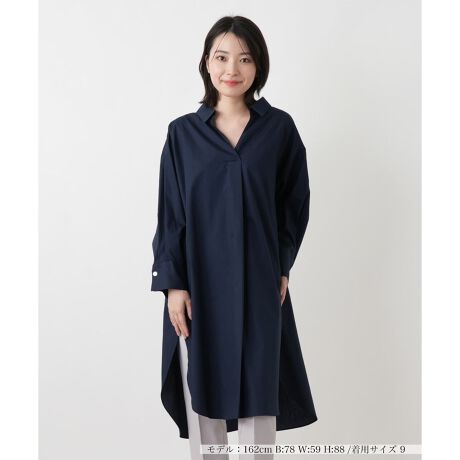 コットン仕立てのナチュラルな風合いが心地よい、スキッパータイプのロングシャツブラウスです。顔周りをすっきりと見せるワイドな襟が抜け感を演出し、初夏の爽やかな装いにぴったりのアイテムに仕上げました。バックスタイルには大きめのリボンをあしらい、後ろ姿まで抜かりなく女性らしいアクセントを添えています。ゆったりとしたシルエットに、後ろ裾を長めにしたラウンドヘムと深めのサイドスリットを施し、動くたびに軽やかなニュアンスが生まれるデザインに。やや薄手で軽快な生地感は、パンツと合わせたレイヤードスタイルもおすすめです。