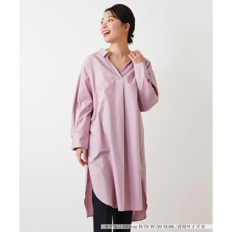 コットン仕立てのナチュラルな風合いが心地よい、スキッパータイプのロングシャツブラウスです。顔周りをすっきりと見せるワイドな襟が抜け感を演出し、初夏の爽やかな装いにぴったりのアイテムに仕上げました。バックスタイルには大きめのリボンをあしらい、後ろ姿まで抜かりなく女性らしいアクセントを添えています。ゆったりとしたシルエットに、後ろ裾を長めにしたラウンドヘムと深めのサイドスリットを施し、動くたびに軽やかなニュアンスが生まれるデザインに。やや薄手で軽快な生地感は、パンツと合わせたレイヤードスタイルもおすすめです。
