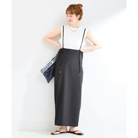 ベーシックなノースリーブカットソーはややゆったりめに、キャミワンピースはIラインシルエットですっきりとした見え感にしています。華奢な細ストラップは長めの設定にし、大人っぽく着れるようなデザインにしました。