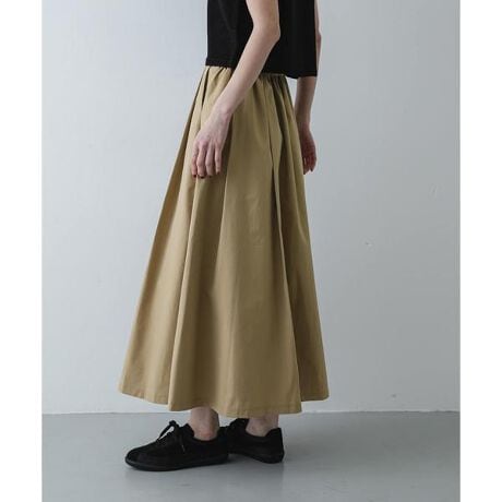美しいドレープと、程よいハリ感が魅力のタックフレアスカート。クリアでシンプルなデザインながら、贅沢に施されたタックが等身大の華やかさを演出してくれます。ポリエステルツイルの軽やかな質感は、一日中履いていても心地よく、忙しい毎日のワードローブに頼もしい存在。ブラウスを合わせたクリーンなオフィススタイルから、カットソーで力を抜いたデイリースタイルまで、自分らしい洗練された佇まいを叶えてくれる一枚です。