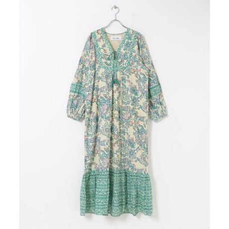 金糸を織り込んだドビー織の生地にペイズリー柄のようなフラワープリントを重ねたドレス。裾に入ったボーダーの切り替えが軽やかな抜け感をプラスしています。リラクシーな着心地でありながら、ヨークの切り替えによって顔まわりは自然と華やかに。袖はボリュームのあるパフスリーブ。袖口にゴムを入れているので、たくし上げることで丸みのある柔らかなシルエットに変化。裏地付きなので透けを気にせず、一枚で安心して着られます。肌触りのよいコットンのドレスは、年中快適に着られる一枚。足元はスニーカーからブーツまで、どんなスタイルにもなじみます。