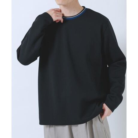 首元に施したヘリンボン調のリブと配色ラインがさりげないアクセントになったロングスリーブカットソー。スウェットほど重くならず、Tシャツよりもきちんと感のある絶妙なバランスで、大人のカジュアルスタイルに取り入れやすい一枚です。肩を落としたドロップショルダーと程よくゆとりのあるシルエットがリラックス感を演出しつつ、袖口や裾はすっきりと仕上げることでクリーンな印象に。1枚で着てもサマになり、デイリーコーデに活躍するアイテムです。