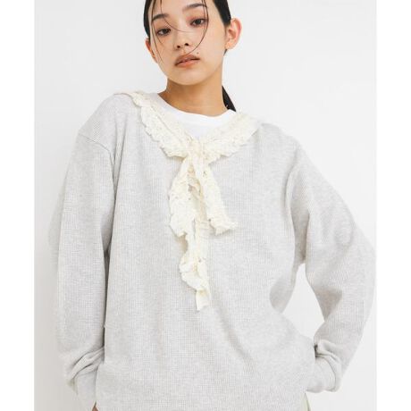 カジュアルなワッフル素材に、アンバランスなレースを施したデザイントップス。身体のラインを拾い過ぎないサイジング、デコルテがすっきりと見えるVネック仕様もポイントです。インナーにプリントTEEを入れた着こなしもおすすめです。