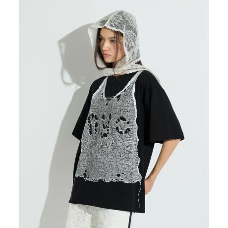 甘さのあるレースのような雰囲気を持ちながらも、ダメージ感のあるデザインが加わることで、甘くなりすぎずクールに着こなせる大人のグラフィックTシャツに仕上がっています。