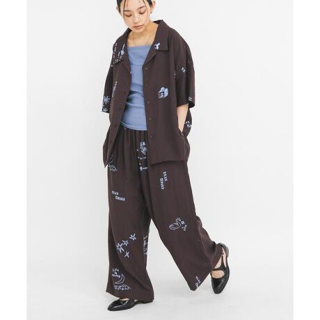 メンズライクなシャツに、キャッチー且つインパクトのある刺繍プリントを全面に施したトップス。プリントですが刺繍に見えるデザインを採用しており、夏にぴったりな落ち感のあるさらっとした素材もポイントです。羽織としても使用でき、同素材のTATTOOワイドイージーパンツ(KB26230-2045290)とセットアップの着こなしもおすすめです。