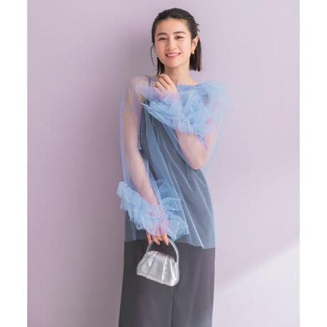 ふんわりと広がるチュールが、装いに華やかな表情を添えるBLOOMING TULLE DRESS。軽やかなチュールを贅沢に重ね、肩まわりや袖口に立体的なフリルをあしらうことで、動くたびに柔らかなニュアンスを生み出します。透け感のあるチュールとシックなインナーのコントラストが、甘さの中にも洗練された印象をプラス。顔まわりを優しく包み込むデザインは、さりげなく華やぎながらも上品な存在感を演出します。すっきりとしたシルエットの身頃とのバランスにより、チュールのボリュームが引き立ち、スタイリングに奥行きをもたらす一着に。可憐さとモード感を絶妙に併せ持つ、特別感のあるチュールドレスです。