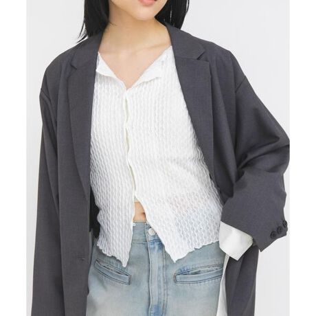 少し柔らかなイメージのある透かしジャガード素材を使用した女性らしいトップス。前開き仕様になっているので羽織としても使用いただけます。程よくコンパクトなサイジングもポイント。前の釦を閉じるとキーネックデザインになっており、抜け感のある着こなしが叶います。