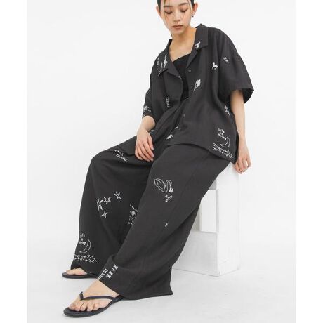 ワイドでリラクシーなパンツに、キャッチー且つインパクトのある刺繍プリントを全面に施した1本。プリントですが刺繍に見えるデザインを採用しており、夏にぴったりな落ち感のあるさらっとした素材や楽に穿けるウエストゴム仕様もポイントです。同素材のTATTOOオーバーシャツ(KB26230-2035290)とセットアップの着こなしもおすすめです。