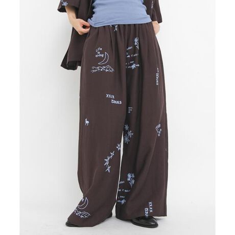 ワイドでリラクシーなパンツに、キャッチー且つインパクトのある刺繍プリントを全面に施した1本。プリントですが刺繍に見えるデザインを採用しており、夏にぴったりな落ち感のあるさらっとした素材や楽に穿けるウエストゴム仕様もポイントです。同素材のTATTOOオーバーシャツ(KB26230-2035290)とセットアップの着こなしもおすすめです。
