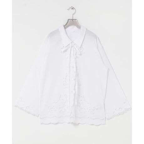 コットン100%のナチュラルな風合いを活かしつつ、フロントから裾、袖口にかけて施された緻密な刺繍が、大人の甘さを上品に引き立てます。