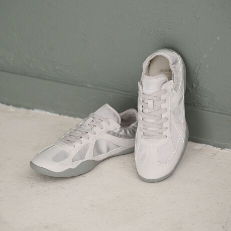 バレエシューズのような華奢なフォルムに、ステッチディテールなどスポーティな要素を加えた一足は、コーディネートを新鮮な印象に導きます。