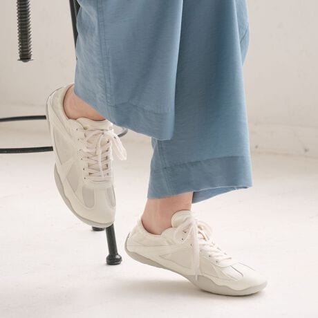 バレエシューズのような華奢なフォルムに、ステッチディテールなどスポーティな要素を加えた一足は、コーディネートを新鮮な印象に導きます。