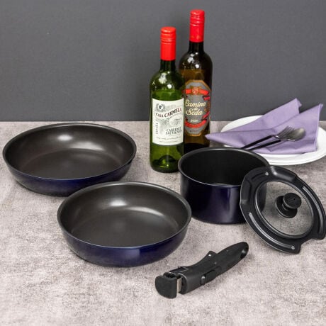 ●フライパン22cm・フライパン26cm・鍋18cm・鍋フタ18cm・専用取っ手のセットです。
