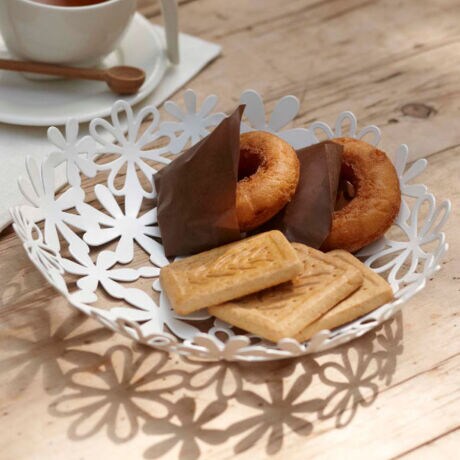[型番:281172]【デザイン】●お花のモチーフが華やかな、スチール製バスケットSサイズです。●フルーツやお菓子の収納に最適です。●小物の収納にも使える、便利なサイズ感です。●清潔感のあるデザインなので、様々なインテリアに良く馴染みます。●本体素材はスチール製で、重厚感があり、丈夫で長持ちします。【スペック】サイズ/約幅22×奥行22×高さ4.5cm重量/約240g内容量/1個材質/スチール(粉体塗装)生産国/中国製