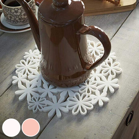 [型番:315318]【デザイン】●フラワーのモチーフが可愛いなべ敷きです。●レースのように華やかなモチーフで、キッチンをパッと可愛く彩ります。●シリコン樹脂で出来ているので滑りにくく安心です。●丸洗いできるので、いつでも清潔にお使いいただけます。【スペック】サイズ/約横20×縦20cm厚さ:約0.5cm重量/約100g内容量/1枚材質/シリコン樹脂種類/ホワイト、ピンク生産国/中国製耐熱温度/180度パーツ別耐冷温度/-40