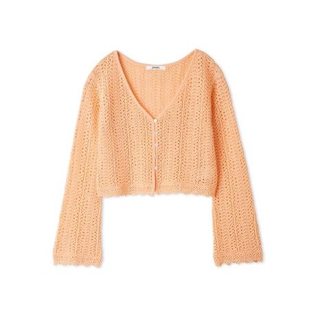 流れるような柄編みを表現したナチュラルな風合いのクロシェニットカーディガンです。艶やかなシェルボタンがアクセントに。短めの着丈ですが身幅はゆったりのため、リラクシーに羽織っていただけるアイテムです。袖口はベルスリーブで抜け感を出しました。猛暑日にも軽やかに着ていただけます。水着の上に羽織っても素敵です。