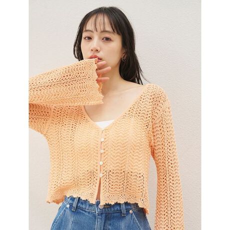 流れるような柄編みを表現したナチュラルな風合いのクロシェニットカーディガンです。艶やかなシェルボタンがアクセントに。短めの着丈ですが身幅はゆったりのため、リラクシーに羽織っていただけるアイテムです。袖口はベルスリーブで抜け感を出しました。猛暑日にも軽やかに着ていただけます。水着の上に羽織っても素敵です。